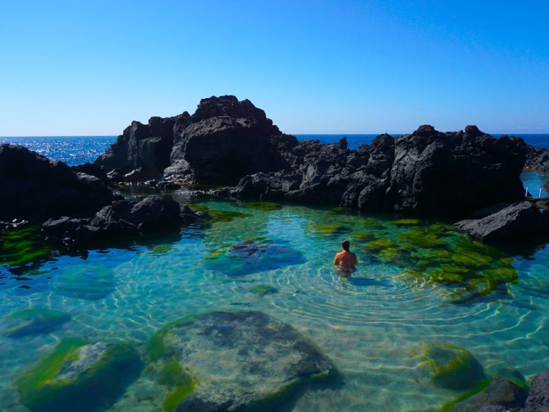 Une ville classée au patrimoine mondial de l’Unesco (Angra do Heroísmo), une immense couverture en patchwork de prairies verdoyantes tissée dans le plus grand cratère des Açores (Serra do Cume), et un volcan unique au monde dans lequel on peut entrer pour regarder le ciel depuis l’intérieur ( Algar do Carvão). Rien que pour ces trois attractions, la visite de Terceira, troisième plus grande île de l’archipel, vaut le détour. Mais Terceira a bien plus à offrir à ceux qui la découvrent : des baignades dans des eaux transparentes entre les coulées de lave à Biscoitos, des sentiers riches en biodiversité parmi des mystères noirs, des caldeiras fumantes et les plus grandes zones de végétation endémique de tout l’archipel. Le tout se combine avec une gastronomie généreuse, de bons vins et des fêtes… beaucoup de fêtes.